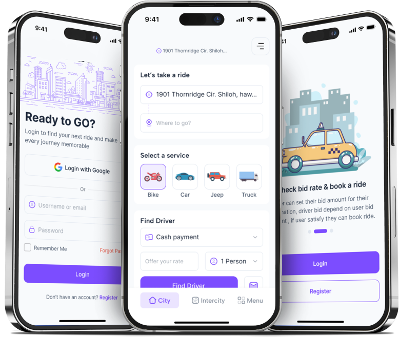 Riders enter their trip details, and drivers submit competitive bids. Riders can compare offers based on price and ratings.